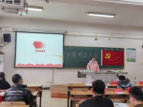 最后,学生第三党支部书记胡文霞老师上台作总结发言。胡文霞老师首先对成为预备党员以及正式党员的同志们表示了热烈祝贺,紧接着着重强调了身为学生党员,要履行党员的义务与权利的同时要谨记作为一名学生的本职工作。时刻牢记党的宗旨,要做学生的榜样,在今后的生活中要以党规党章规范自己、升华自己。强调了党员同志在新时代的生活中更要起到带头作用,做好一名学生党员应有的先锋带动作用。