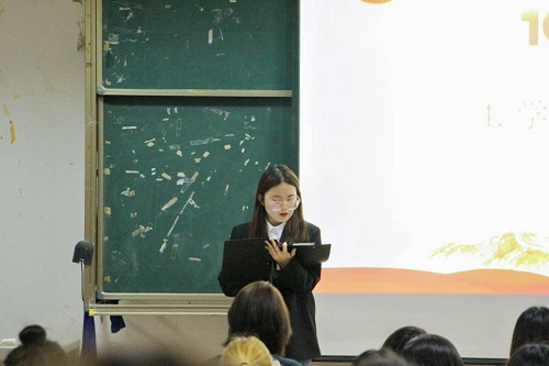 紧接着,由学生代表冯雅宁同学上台发言,她讲到学员们应该积极学习党章,从思想、学习、工作上感受党的号召,端正自己的入党动机,努力成为一名优秀党员。