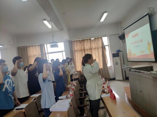 最后由经济与管理学院学生第二党支部书记刘荣老师带领全体同学在党旗下进行了宣誓。