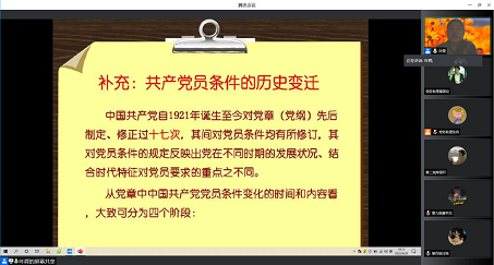 我们党在不同的历史时期,对于党员有着不一样的条件要求,叶舜老师分别从建国初期、社会主义建设初期、改革开放时期给同学们讲述了这些时期党员的标准,同时告诉大家新时代对党员有新的要求,共产党员要与时俱进,对自身要有更高的标准、更严的要求,鼓励大家多了解党的知识,为自己的理论知识打下坚实的基础。