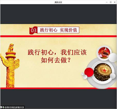 张老师最后抛出问题:从自身出发,我们如何践行初心?学员们积极思考,踊跃回答,每个人都有不同的角度,学员汪心悦表示我们要做好带头作用,调动同学积极性;学员谌俊杰说从身边小事做起,帮助身边的人;学员肖雪琴说坚持实施求实,在班级工作中更好的服务大家等等。
