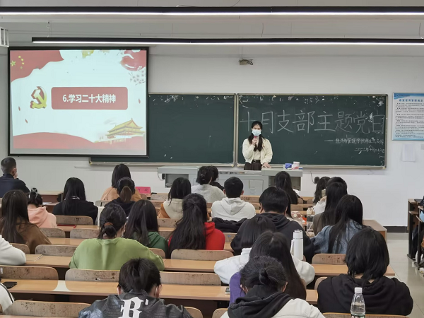 为热烈庆祝党的二十大胜利召开,学习贯彻好党的二十大精神,2022年10月28日上午12:15,经济与管理学院党总支全体学生党员在一教303开展了题为“喜迎党的二十大 ,砥砺奋进新征程”支部主题党日活动。