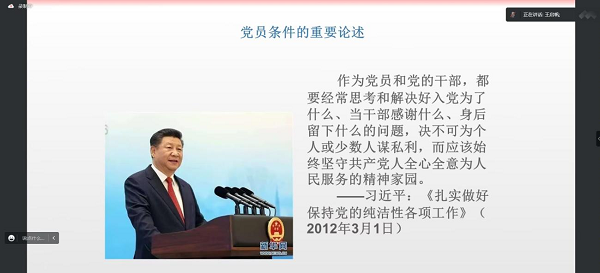 课堂开始,王启帆书记带领我们学习了国家历代领导人对党员的条件的论述,然后王启帆书记又分别从申请入党的基本条件、党员的本质要求、党员的具体条件、党员条件的历史演变这四个方面进行具体讲解。随后,王启帆书记又从义务和权利的关系、新时代合格党员两方面进行授课。