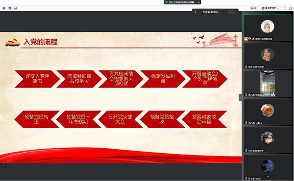 虽然是线上课程,但是同学们仍旧保持着积极的学习态度,坐在屏幕前认真听程老师讲课,并做好课堂笔记。新时代,给了青年人更多新平台、新机会,新时代,广大青年生逢其时,同时也要为这个时代付出自己的努力。发展党员工作是党的基层组织的一项经常性工作,也是加强党的建设一项重要任务,党一直以来都是以最高标准要求党员,以最规范的程序来选拔新党员,以此来保证党的先进性。通过学习“入党流程和程序”,也让同学们对入党的有关知识有了更加全面而系统地认识,希望同学们今后能够明确自己的入党动机,牢记党的根本宗旨,在实践中磨练自己,帮助他人,完善自我,从而争取早日成为一个合格的中共党员。
