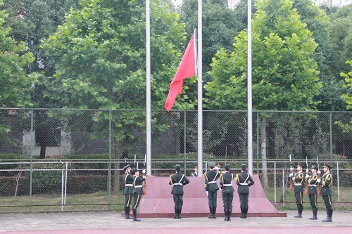在主持人魏笑的开场介绍之后,国旗护卫队将鲜艳红旗护送至旗台,全体师生庄严肃立。伴随着雄壮激昂的《义勇军进行曲》,向国旗行注目礼,表达出对祖国的无限热爱和对广大劳动人民的崇高敬意。