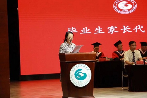 经管学院毕业生弓长马也的妈妈作为毕业生家长代表发言,回顾孩子的大学四年生活,特别要感谢学校老师的教诲,毕业是结束同样也是开始,始终要坚守梦想,无论经历多少困难,都要做自己想做的事情。
