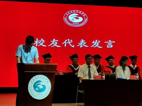 全国五一劳动奖章获得者董骞作为校友代表发言,提出个人建议,细节决定成败,关注细节才能防微杜渐,要勤于思考,坚持创新同时也要保持初心,坚持不懈,以饱满的热情投身到今后的工作之中。