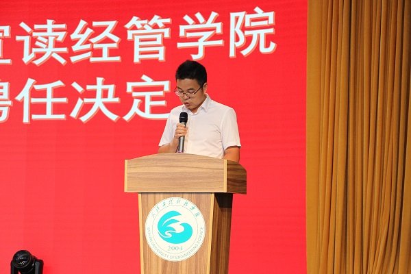 毕业典礼在庄严的国歌中拉开帷幕,王启帆书记宣读经济与管理学院校友联络员聘任决定。为进一步加强校友之间、校友与母校之间的联系,培养在校生校友意识,充分发挥校友的桥梁与纽带作用。根据校友联络员选聘办法的要求,经班级推荐,学院审核,决定聘任郭元节等62位同学为2022届毕业生校友联络员。并对全体毕业生寄语希望,希望大家主动支持校友联络员的工作,各校友联络员要不负学院重托,不忘职责使命,把本届校友联络好、组织好、团结好,密切保持与学院的联系,为母校的建设、发展和校友事业的进步贡献力量。