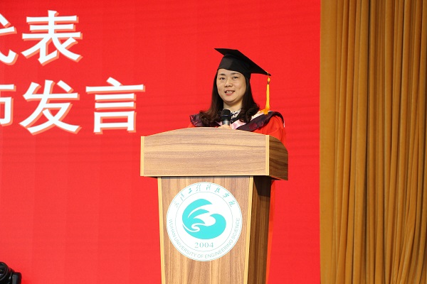 教师代表唐烨老师带着她对毕业生殷切地期盼上台发言。她对毕业生将来的生活献上美好的祝福!同时,希望毕业生们尽快适应新工作、新环境,希望同学们把毕业看做新的起点,继续学习。希望毕业生们能够铭记老师的教导,为社会多做贡献,成为学校的骄傲。