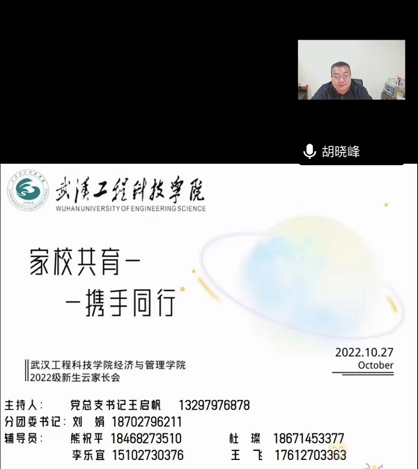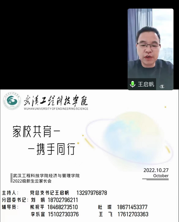为加强家庭与学校的密切联系,全方面促进学生的健康成长,2022年10月27日晚19:00,经济与管理学院2022级新生“家校共育,携手同行”线上家长会顺利召开。