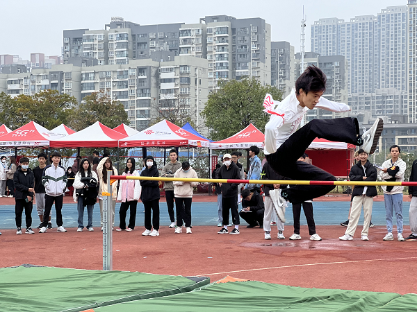跳高选手们单脚弓步弯曲,另一只挺拔地立在半空,越过高杆,俯视着学校驰骋的赛场,踏在胜利的泥土地上。腾空,腾跃而起向目标飞去;过杆,优美的弧线、潇洒落地。辉煌在你们脚下铸就。