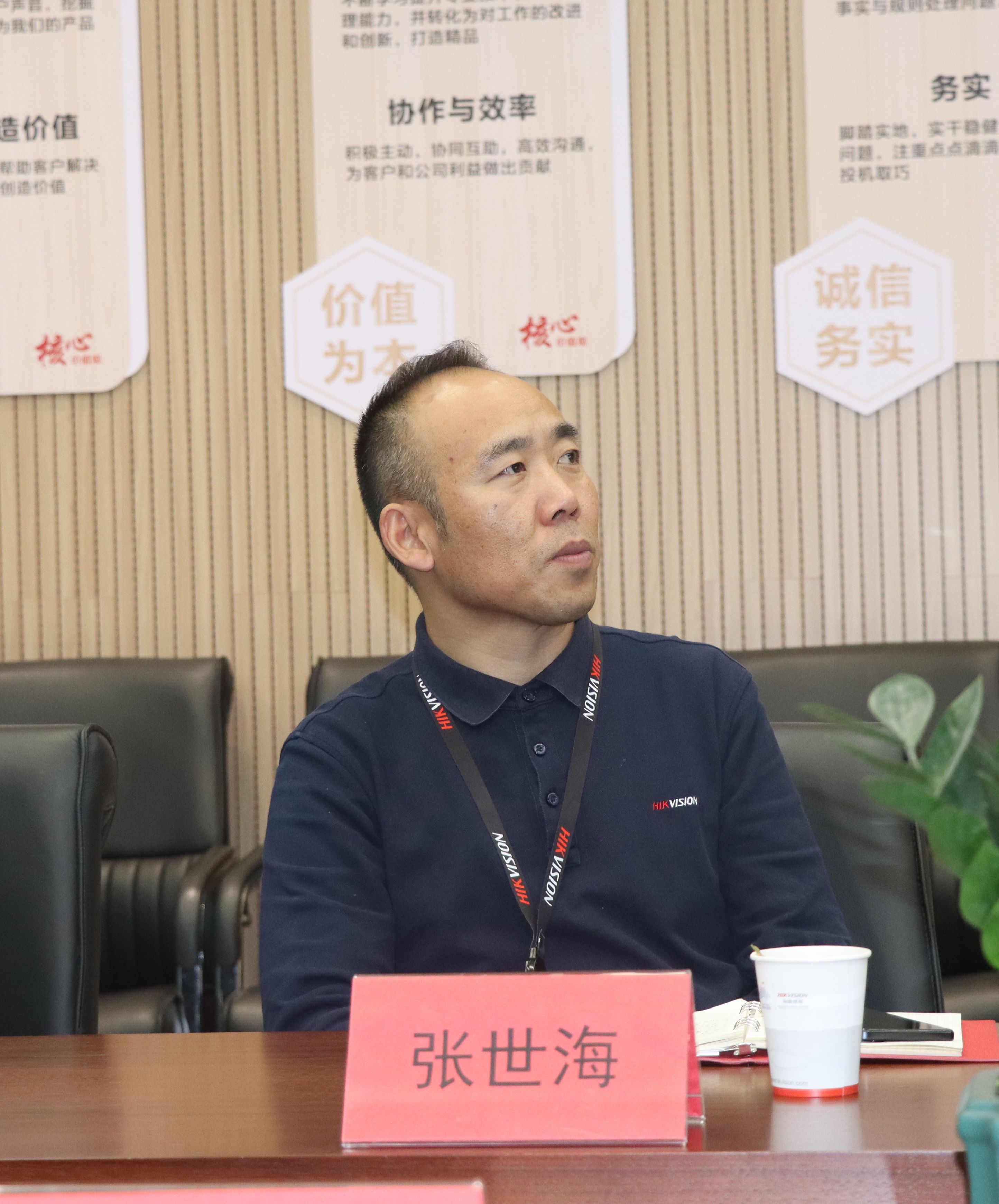 双方在海康威视一楼会议室进行了校企合作交流座谈。会议由张世海主持。他谈到,自2024年4月份以来,校企双方合作势头良好,推动了大学生毕业实习以及海康威视武汉基地第一届工业装备创意设计大赛等众多项目,取得了丰硕的成果。他希望,下一步校企双方要形成“互补”的共性需求,通过共同搭建意工坊等平台,进一步丰富合作形式,形成稳固的校企联动机制,助力双方共同发展。
