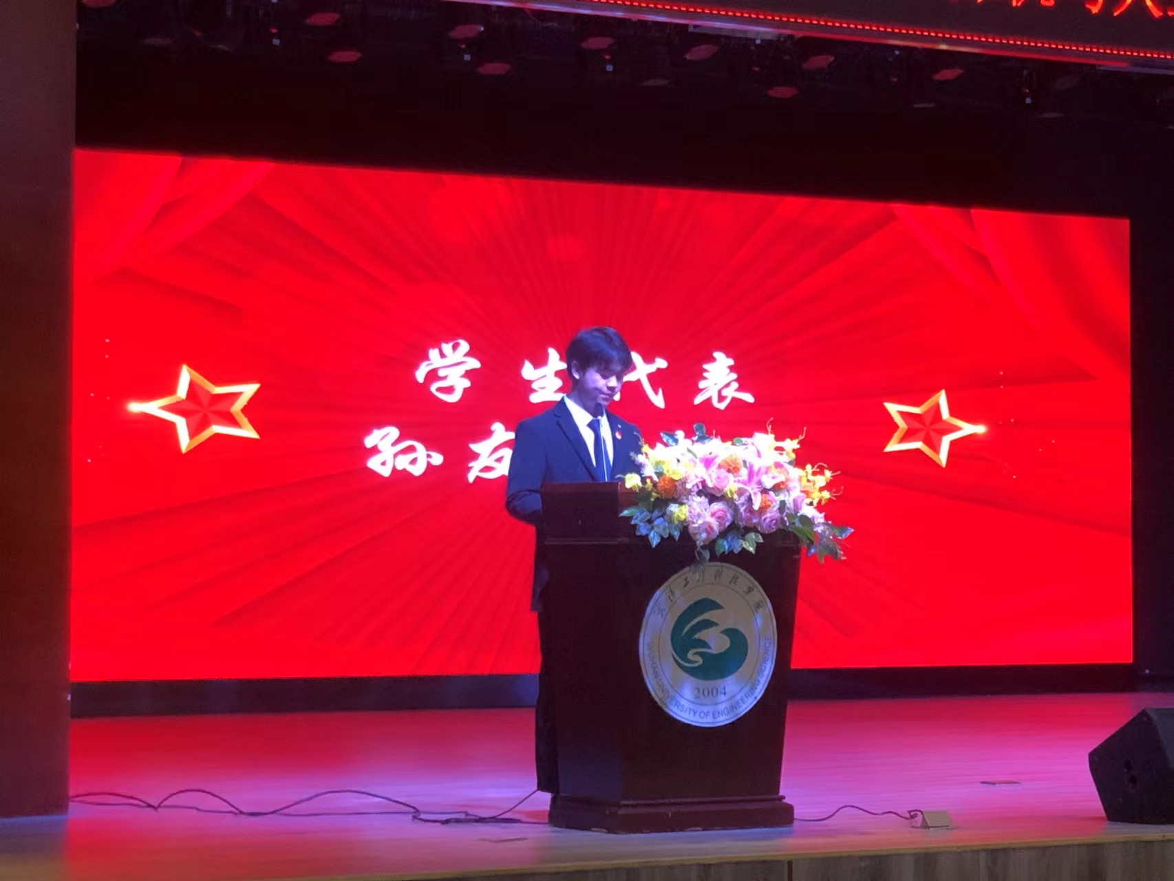 他表示:新的时代赋予了我们神圣的使命感和责任感,建设高水平应用型大学的奋斗目标任重道远。作为学生,我们应该走在时代的前沿,与社会同步,与学校发展同步,从自身做起,弘扬科学和人文精神,用高尚的情操、智慧的头脑、广博的知识和高超的技能来回报祖国与社会。