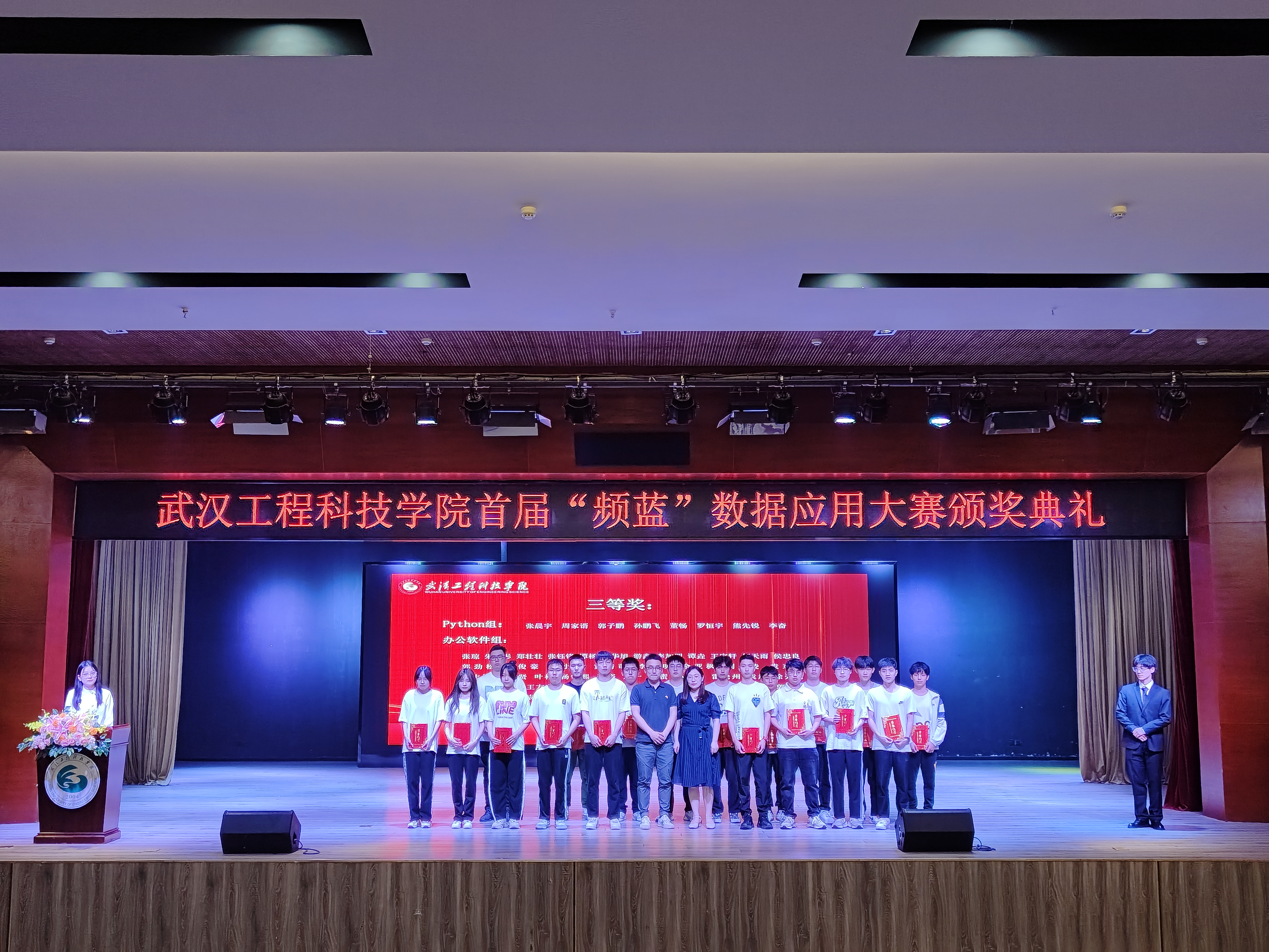 本网讯(通讯员 冯慧敏)4月19日下午1点30分,由武汉工程科技学院主办,计算机与人工智能学院承办的2023年“频蓝”数据应用大赛颁奖典礼在三教报告厅隆重举行。学校党委副书记、校长助理唐军国,学校党委常委、校长助理胡晶晶,教务处副处长刘晓明,频蓝实习平台代表何总受邀出席典礼。计算机与人工智能学院院长蔡之华,党总支书记钟晓星,教学副院长黎丽,院长助理望超,学工科长张冬琦,各系(室)教师,全体辅导员及学生代表参加典礼。典礼由辅导员陈璐瑶主持。