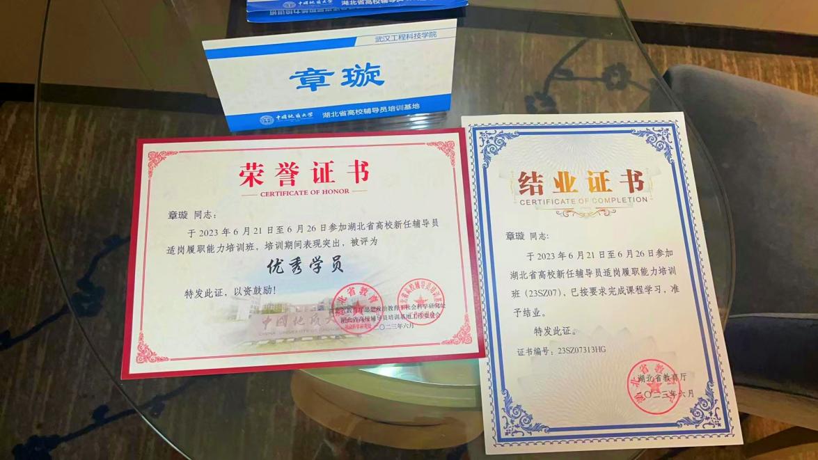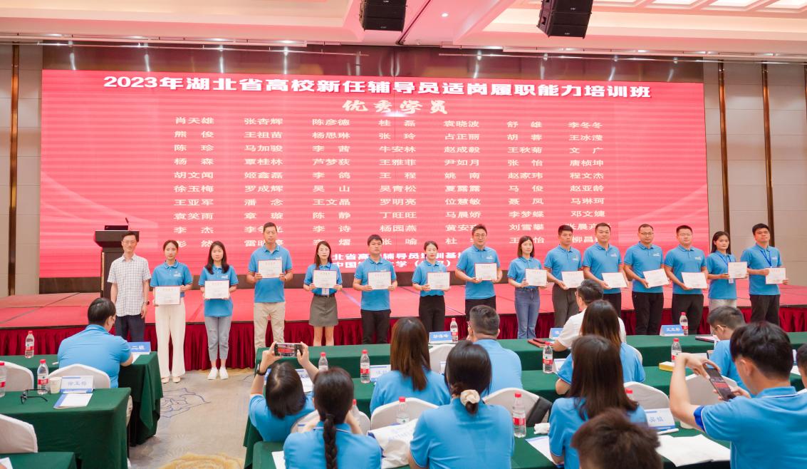 本网讯(通讯员 汤腾达 章璇)6月22日,由湖北省委教育工委、湖北省教育厅主办,湖北省高校辅导员培训基地(中国地质大学)承办的2023年湖北省高校新任辅导员适岗履职能力培训班在武汉圆满结业。据悉,此次培训班共有全省118所高校的近500名辅导员参训,共计评选出70位优秀学员。在本次培训中,我院推选辅导员章璇参加此次培训并获评“优秀学员”荣誉称号,彰显了我院教师良好的职业素养和精神面貌。