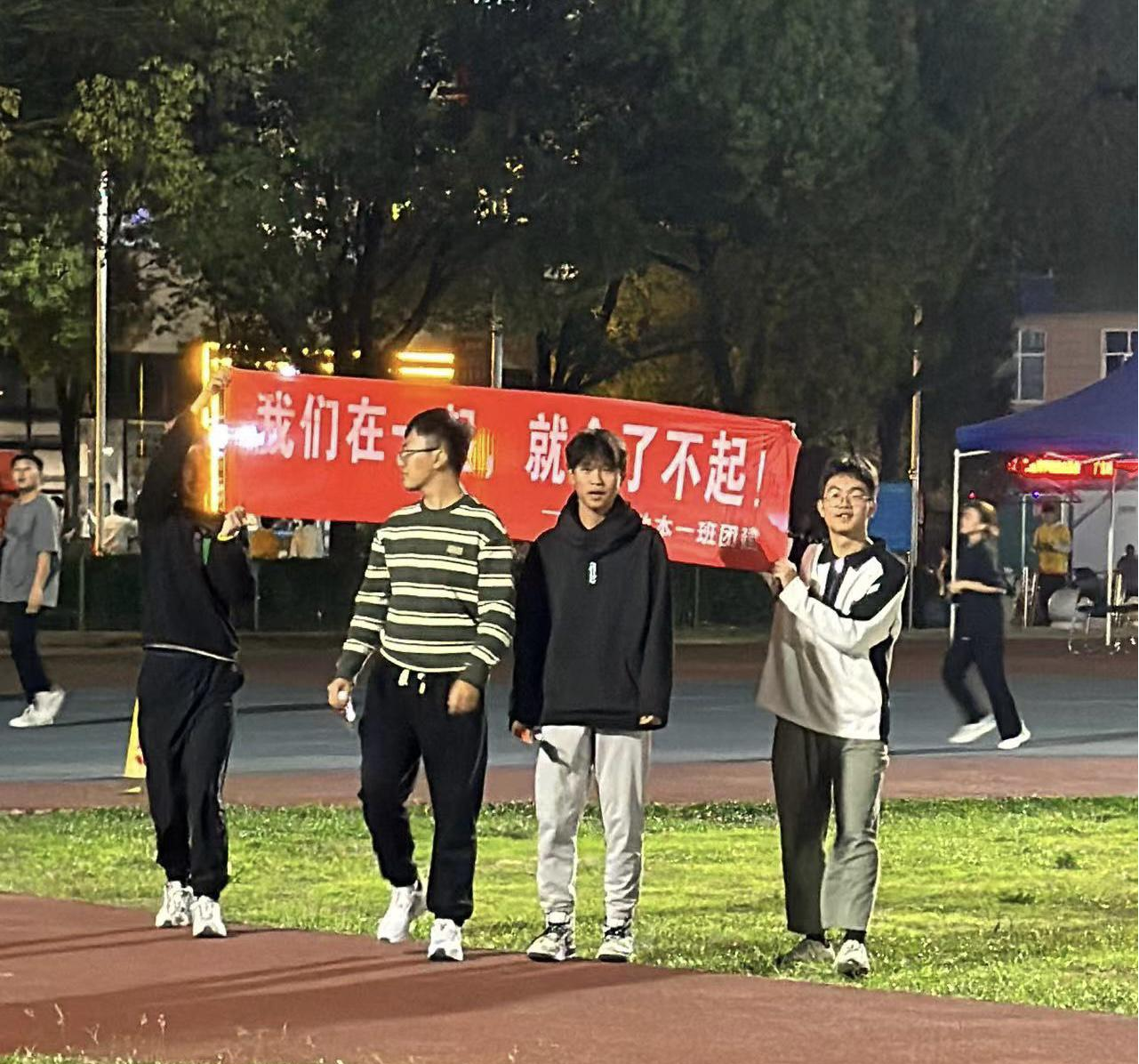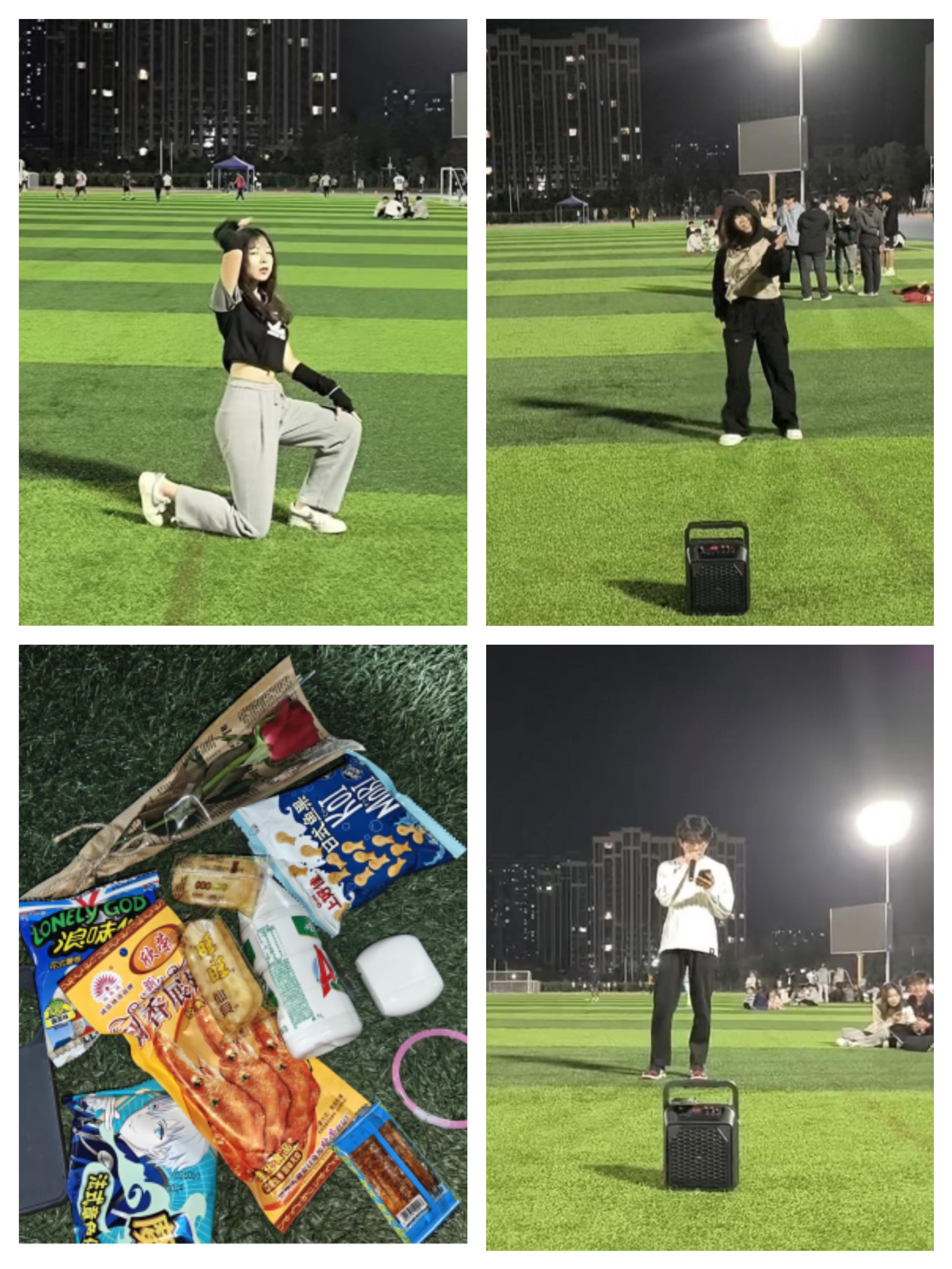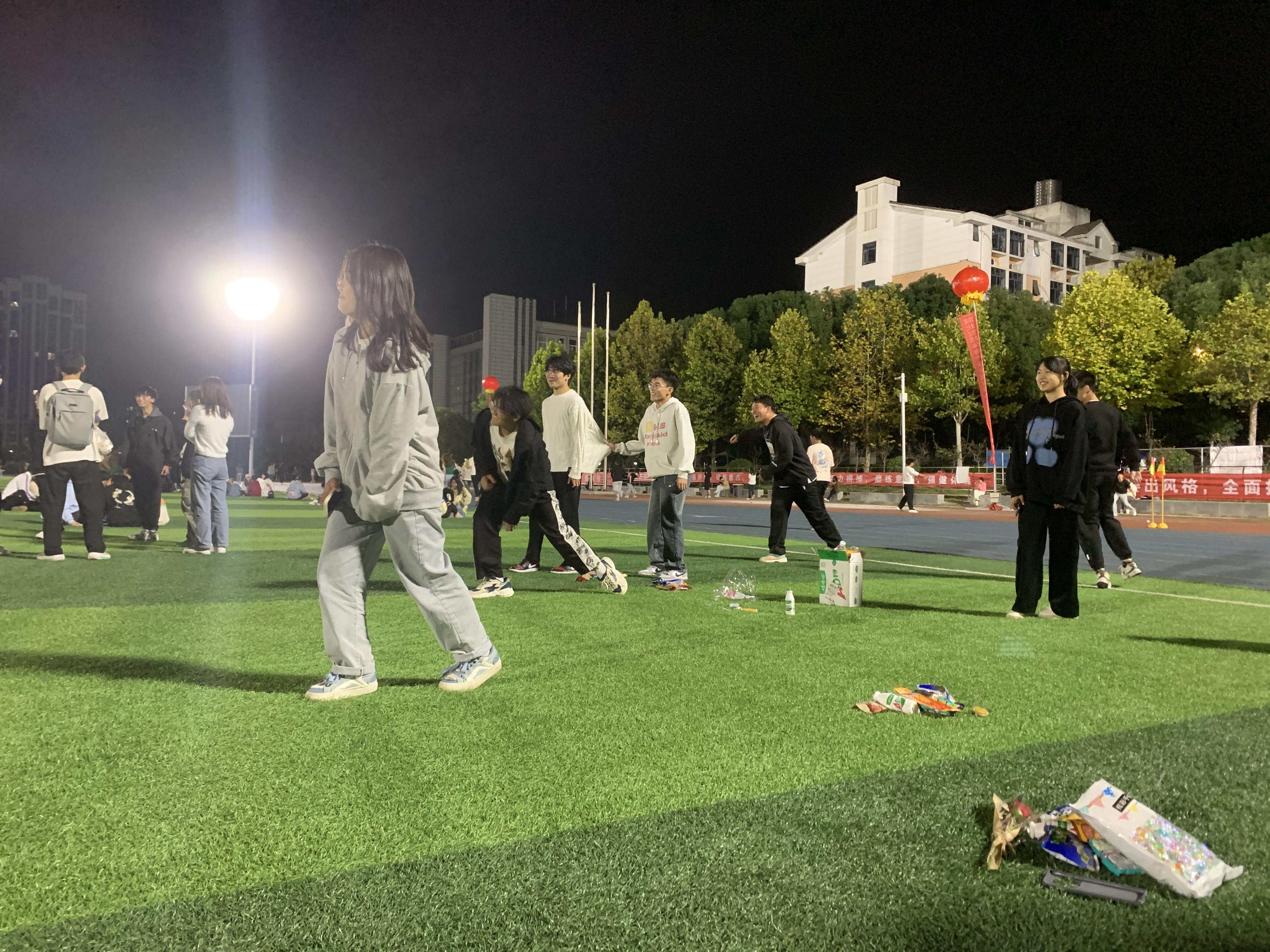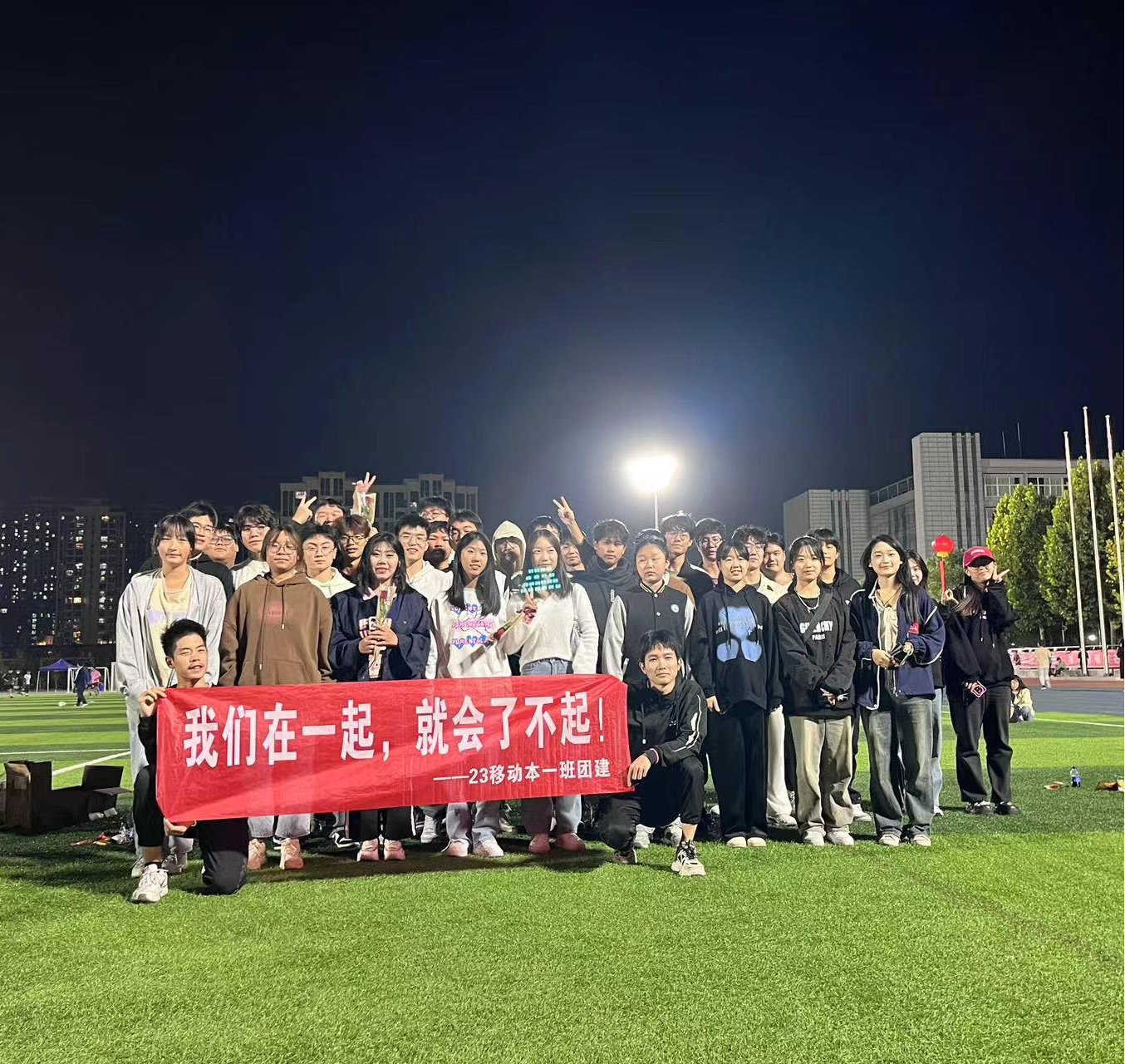 移动本一班于10月20日晚在操场举行团建,活动分三个部分:惊喜礼物,才艺展示,趣味游戏环节。活动入场,班长和团支书在操场门口等候同学,分发鲜花和荧光棒,指明团建位置,纪检委员和生活委员拉横幅、迎接班级同学。