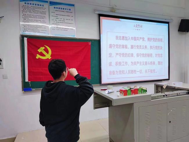 秦义鑫同志带领大家宣誓:“我志愿加入中国共产党,拥护党的纲领,遵守党的章程,履行党员义务,执行党的决定,严守党的纪律,保守党的秘密,对党忠诚,积极工作,为共产主义奋斗终身,随时准备为党和人民牺牲一切,永不叛党。”