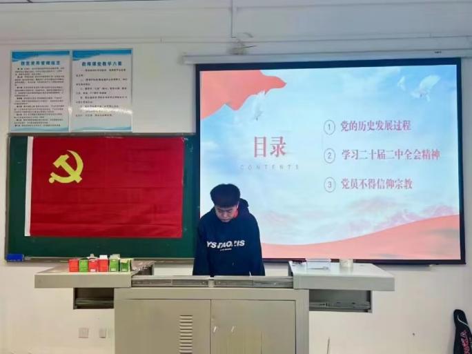 拦永鑫同志带领大家学习,他讲述了中国共产党的发展历程,带领全体党员学习二十届二中全会精神,强调了十四届全国一大一次会议对进一步动员全党全国各族人民为全面建设社会主义现代化国家,全面推进中华民族伟大复兴而团结奋斗具有的重大意义。同时告诫全体党员不得信仰宗教。