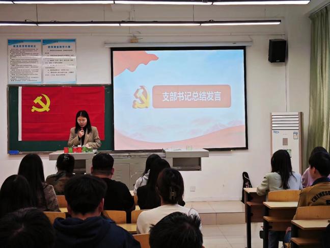支部书记曹雪莹同志总结发言:“我们要认真学习习近平总书记在党的二十届二中全会上的重要讲话精神,同时告诫我们学生党员必须勤于学、善于谋、勇于干。在新时代新征程中彰显新风采、展现新作为。”