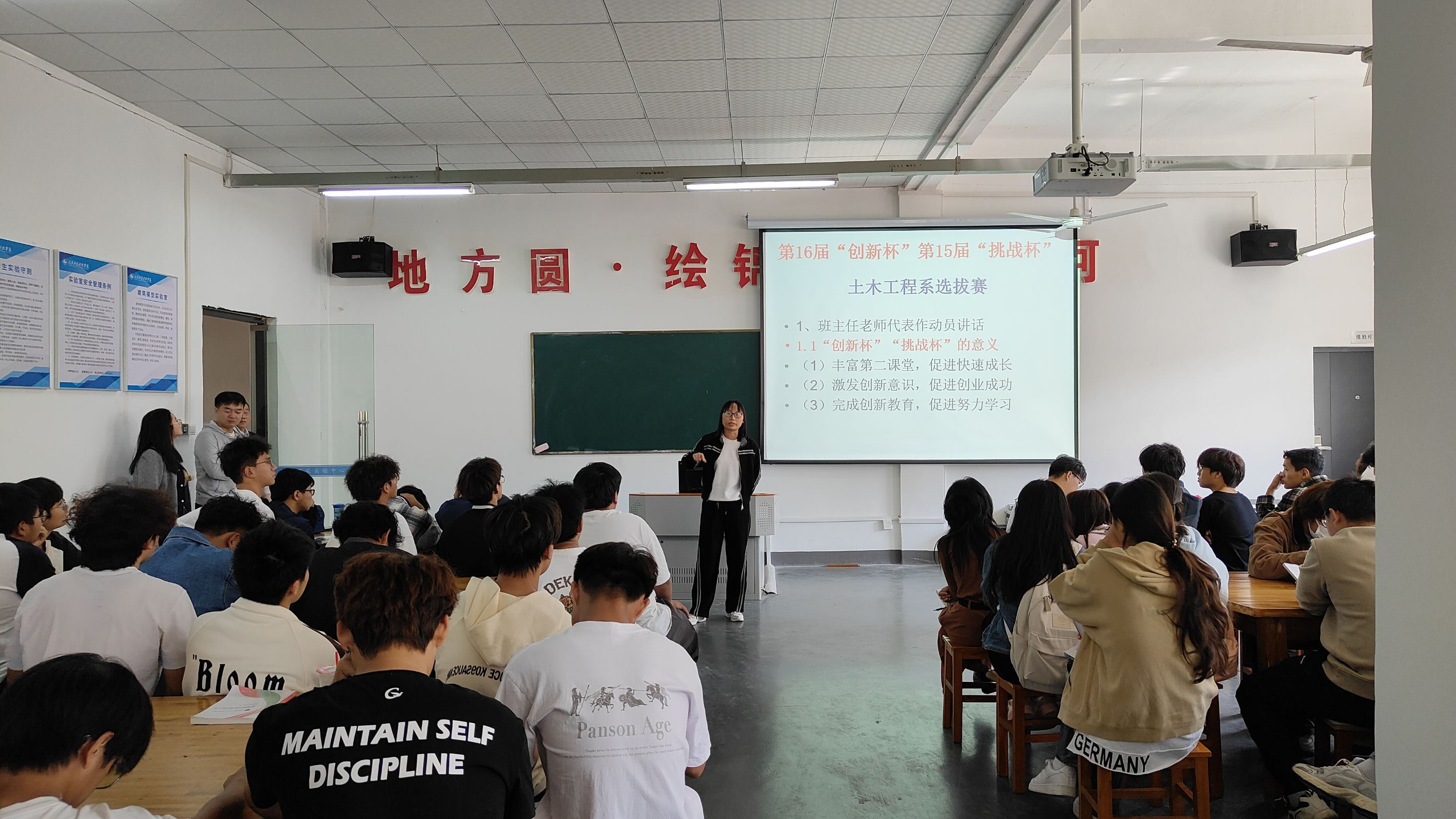 本网讯(刘珉玮、刘玲、龚澳)为了配合学院搞好武汉工程科技学院机械与工程学院第16届“创新杯”大学生课余科研立项大赛暨湖北省第15届“挑战杯”大学生课外学术科技作品竞赛预选赛工作,土木工程系组织全体班主任老师和23土木本1-2班、24土木本1班和24建筑专1-6班全体同学以及21级和22级部分学生,于2024年10月30日在教4-201和教4-202教室分别召开武汉工程科技学院机械与工程学院第16届“创新杯”大学生课余科研立项大赛暨湖北省第15届“挑战杯”大学生课外学术科技作品竞赛预选赛土木工程系选拔赛动员大会,土木工程本科会场由土木工程系尚海静老师主持,专业基础课程组组长辜幕丹作动员讲话,力学结构课程组组长徐丽介绍活动情况。建筑工程专科会场土木工程系龙振华老师主持,房建路桥课程组组长卢小丽作动员讲话,施工管理课程组组长李丹介绍活动情况。