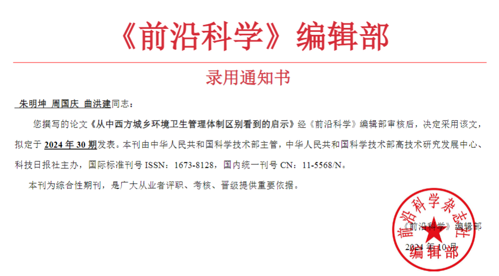 由院办公室刘思、岳瑶老师和辅导员冯星老师指导,24建筑专2班朱明坤、周国庆、曲洪建三位同学完成的《从中西方城乡环境卫生管理体制区别看到的启示》通过《前沿科学》审查,将发表于《前沿科学》2024年30期。