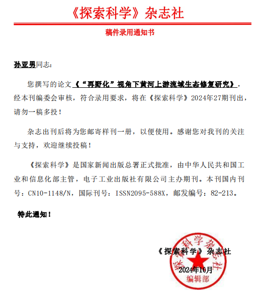 由工程造价系纪仁芹、宋聚老师和辅导员孙琳老师指导,22工程造价本3班(专升本)孙亚男完成的《“再野化”视角下黄河上游流域生态修复研究》通过《探索科学》审查,将发表于《前沿科学》2024年27期。