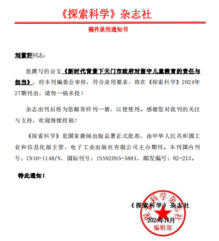 由土木工程系李丹、刘玲、刘珉玮老师指导,24建筑专2班刘紫轩同学完成的《新时代背景下天门市政府对留守儿童教育的责任与担当》通过《探索科学》审查,将发表于《前沿科学》2024年27期。