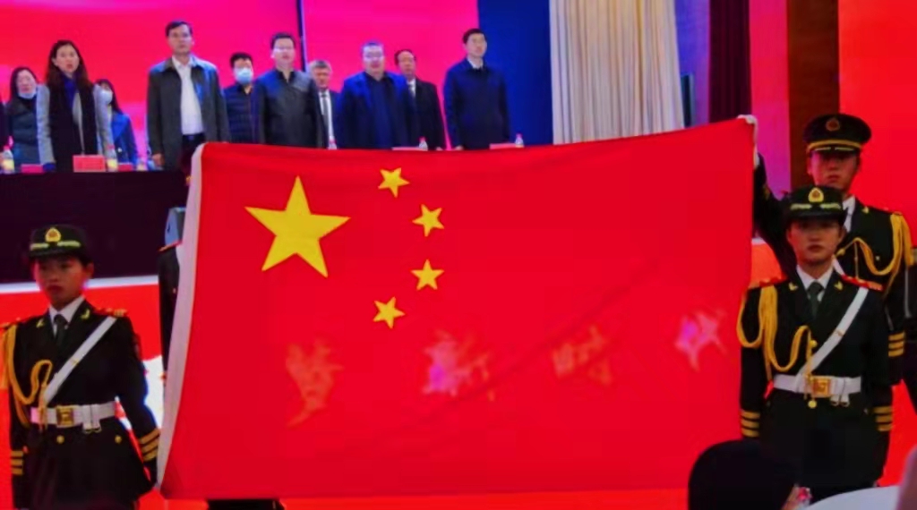 大会伊始,全体同学齐唱国歌,昂扬的歌声响亮在大厅之中,回荡在众人耳边。鲜艳的红色国旗飘扬在台上,拉开了本次大会的序幕。