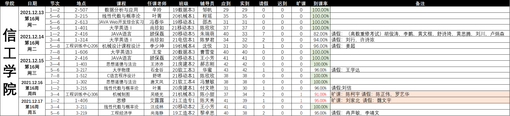 信工学院第十六周学生信息员查课结果,19级总体到课率为97.75%,20级总体到课率为96.29%,21级总体到课率为97.14%。