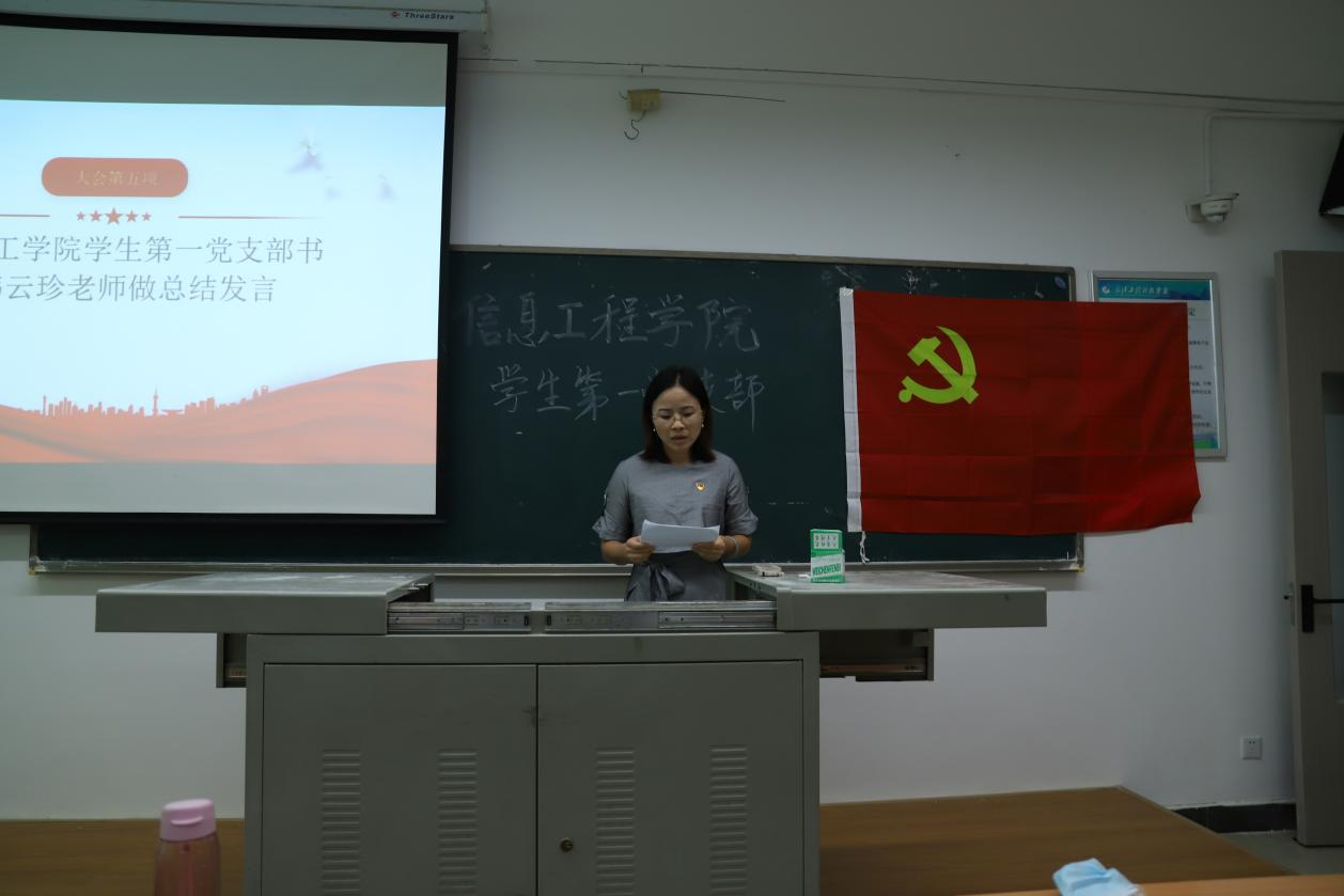 大会第五项,信工学院学生第一党支部书记韩云珍老师就本次会议作总结发言。“抗击新冠肺炎疫情斗争取得重大战略成果,充分展现了中国人民和中华民族的伟大力量,中国人民不屈不挠的意志力,是取得抗击新冠肺炎疫情斗争重大战略成果的根本原因。”最后,韩云珍老师要求各位同志,秉持初心牢记使命,继续虚心学习,严格要求自己,爱国敬业,以更加振奋的精神状态,以坚强的政治定力推动中国特色社会主义发展,为鲜红的党旗增光添彩。