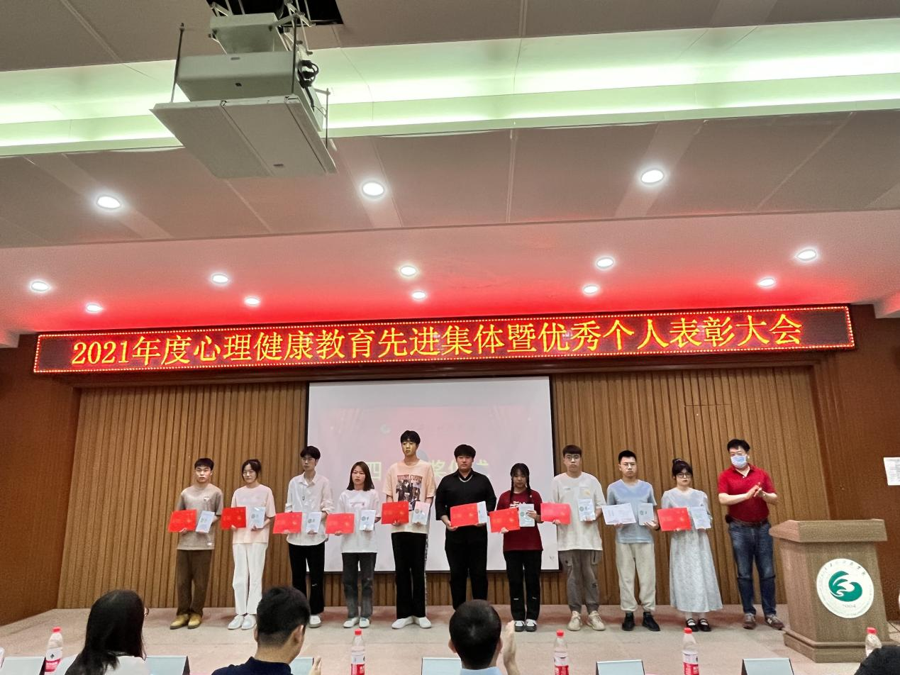 校团委书记钟晓星宣读《武汉工程科技学院关于2021年度“心理健康教育先进集体暨个人”的表彰决定》。51人获得优秀心理委员;4人获得天蓝心协优秀干事;刘欢、尹美颖两位老师获得心理健康教育先进个人;信息工程学院《水果创意拼盘大赛》、经济与管理学院《阳光酷跑》人文学院《女生四自教育》和艺术与传媒学院《心灵涂鸦》获得2021年度心理健康优秀活动奖;人文学院荣获心理健康教育先进集体称号。与会领导为获奖老师同学颁发荣誉证书。