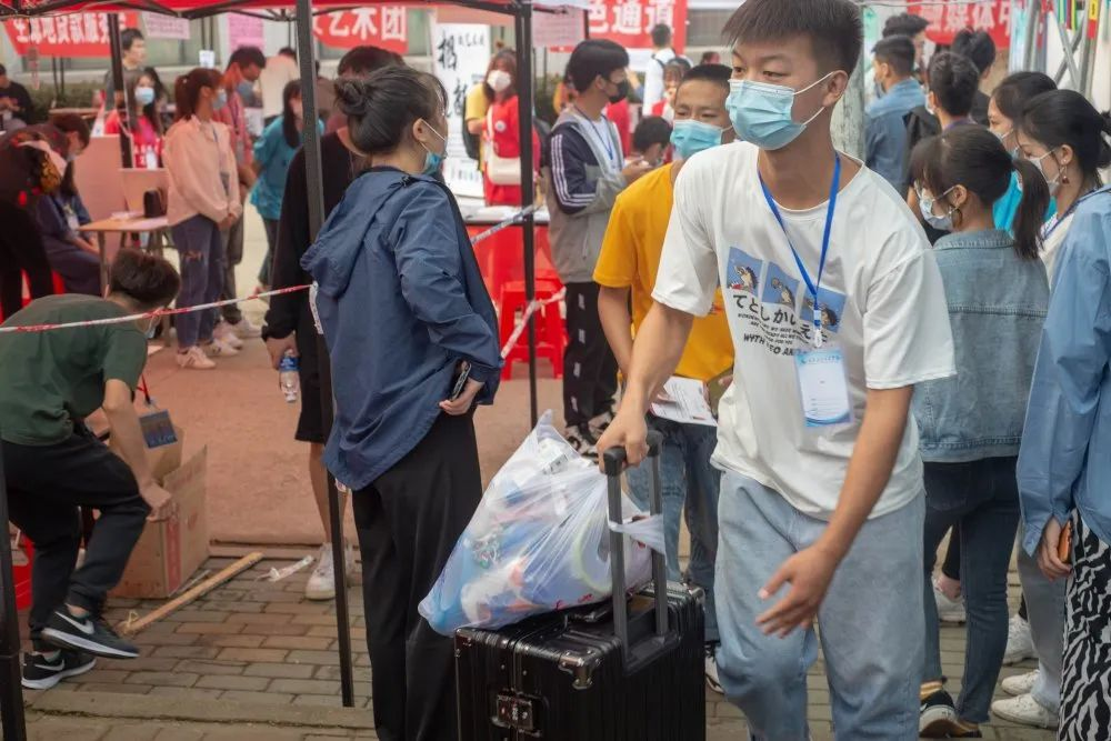 同时照顾到刚刚来到陌生校园的新同学,在报道处附近有学生志愿者们向学生和家长说明学校不同地点的方位并且帮助新生们搬运行李。