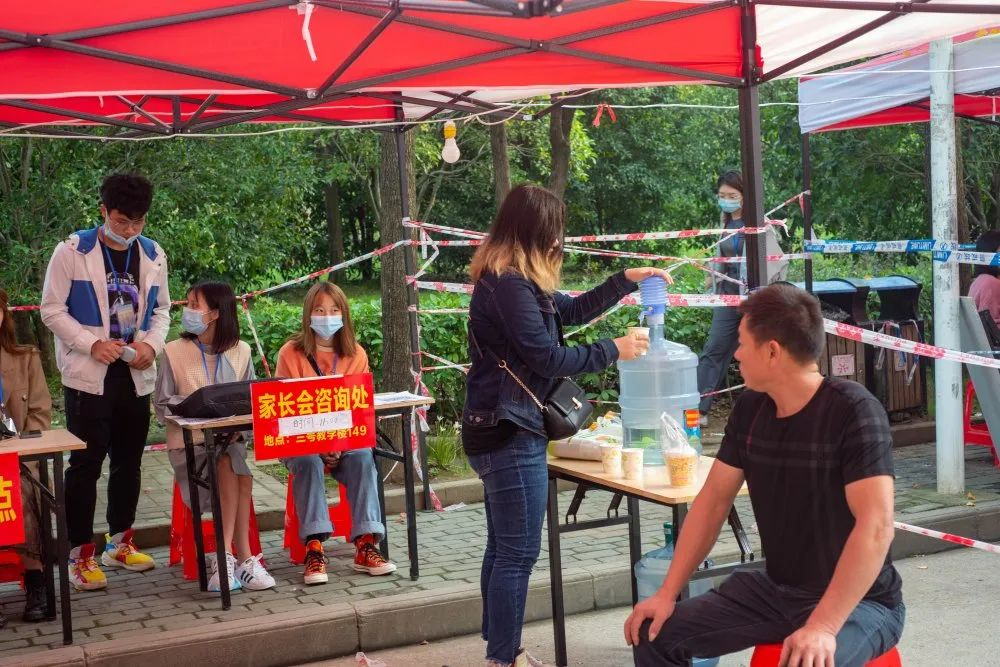 配合学院学生独自报名的规定,在报道处旁设有家长休息区,家长们在这个区域等待报名学生,这里同样有为存在疑惑的家长解答问题的学生工作人员。