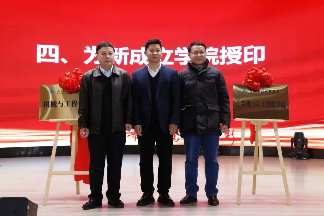 副董事长、党委副书记、常务副校长王加青,机械与工程学院院长钱作勤、党总支书记王农跃共同为机械与工程学院揭牌;党委书记高芸,计算机与人工智能学院院长蔡之华、党总支书记钟晓星共同为计算机与人工智能学院揭牌。