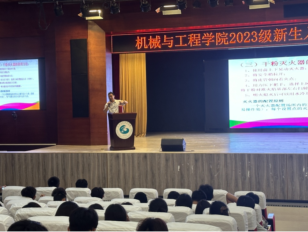 万汉锋老师主要强调大学生的安全防范知识,详细地从“治安”和“消防”这两个角度来进行安全教育。将生活中易上当受骗的危害一一举例,并作出防范指导,确保每位同学能熟知身边存在的安全隐患,以及做好防患于未然的工作。万老师现场认真教学灭火器的使用方法,让学生们能够充分了解火灾来临时的自救技巧,为新生们能安全地度过大学生活打下基础。