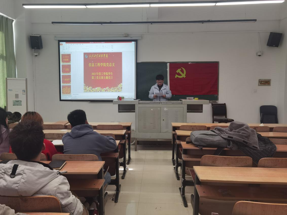 武汉工程科技学院信息工程学院学生第三党支部11月份主题党日活动于2021年11月26日中午12:15分在三教217教室举行召开。