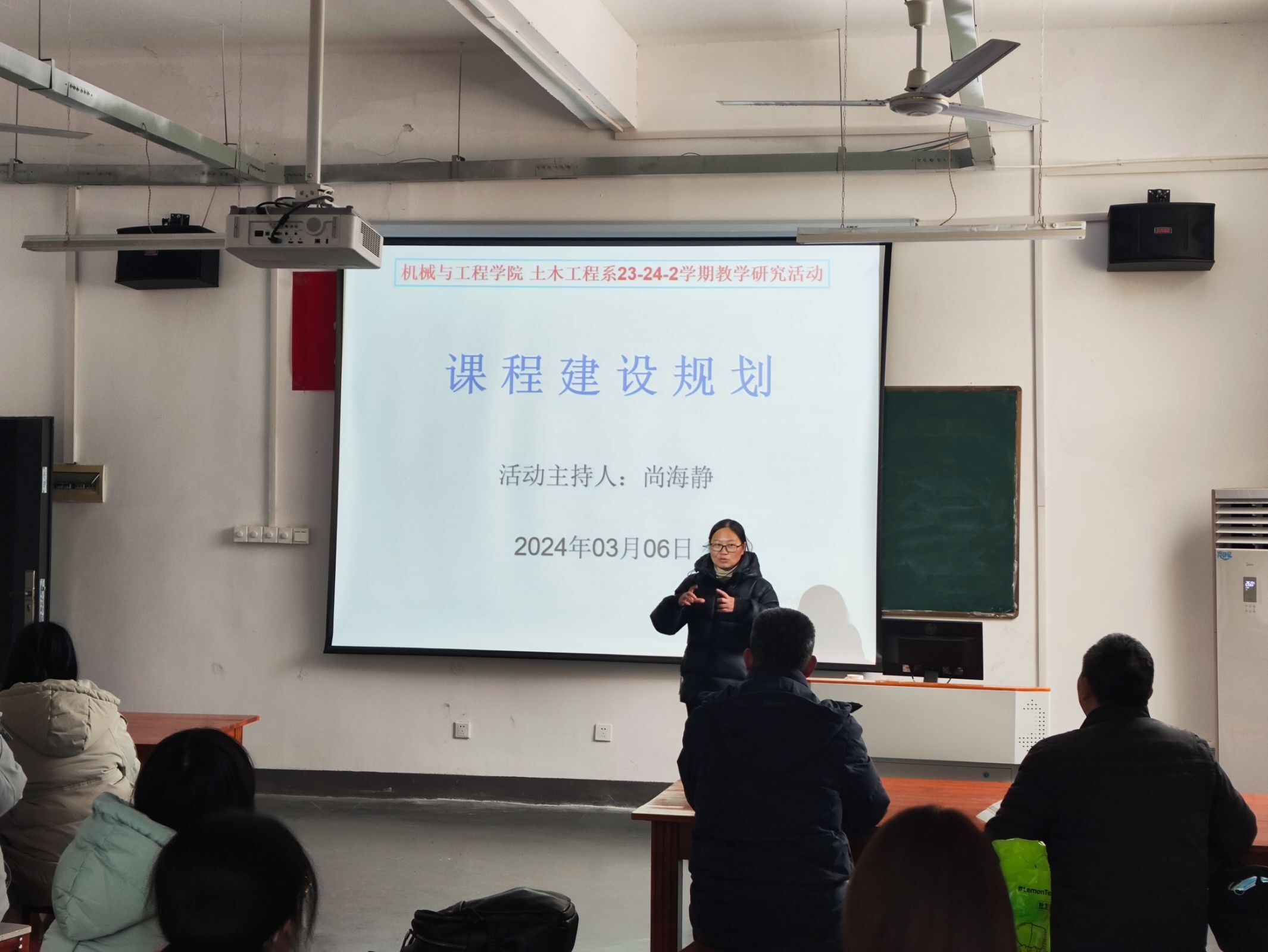 本网讯(通讯员辜幕丹、尚海静、龙海利)2024年03月06日土木工程系全体教师在4教-201教室举行新时代下土木工程类专业《课程建设规划》活动,活动由系主任尚海静主持,教研活动形式采取分组检查后集中汇报方式,分别由专业基础课程组辜幕丹、力学结构课程组徐丽、房建路桥课程组卢小丽、施工管理课程组李丹负责组织执行,此次活动的内容为讨论智能建造背景下专业课程建设规划、讨论修订新版教学大纲、分享创新教案编写技巧、交流PPT制作内容。系主任尚海静要求各个课程组和全体老师认真对待此次活动,对照新工科智能化背景下应用型本科、专科的具体要求制定课程发展规划,进一步修订新版人培教学大纲和教案,完善PPT制作,让日常教学更加受学生欢迎,为培养更多的优秀人才而努力。