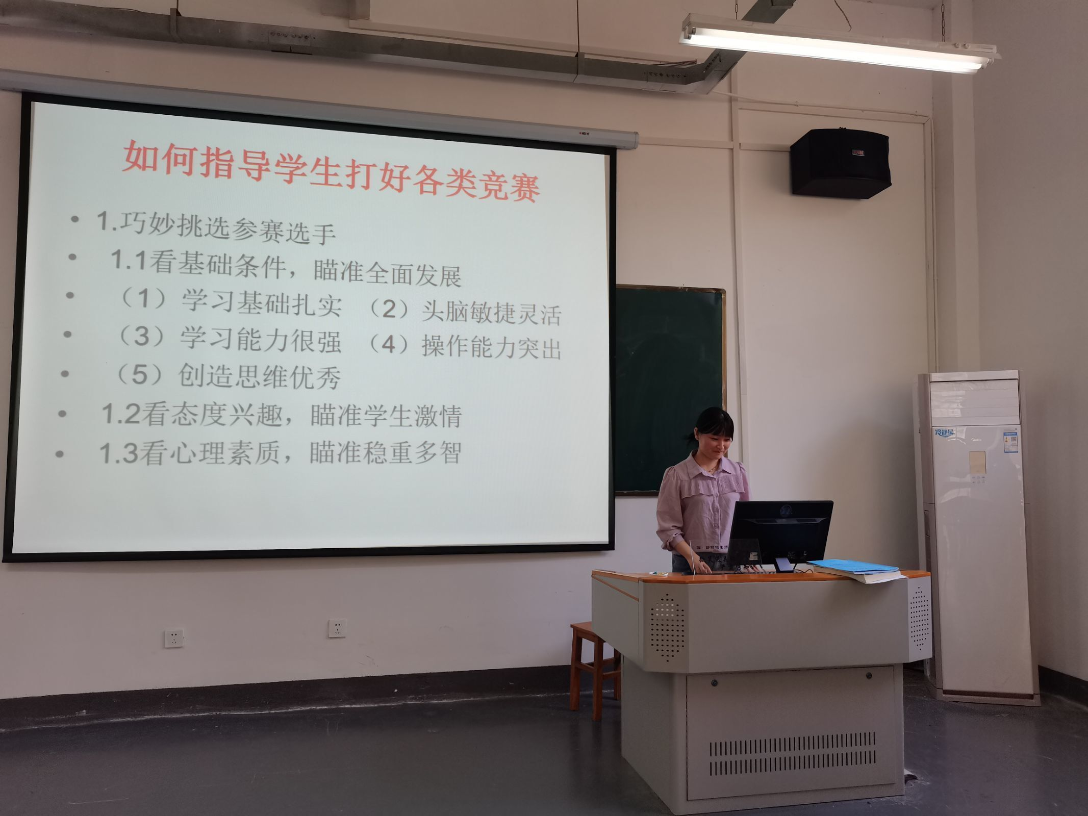其次,力学结构课程组郭丽丽老师就《如何指导学生打好各类竞赛》分享她自身的经验和体会。即:1.巧妙挑选参赛选手:看基础条件,瞄准全面发展;看态度兴趣,瞄准学生激情;看心理素质,瞄准稳重多智。 2.注重训练过程中的细节:整理理论试题重点、技能训练时间充足、抓住技能操作细节、对照评分标准演练。3.狠抓比赛环节的场外指导:赛前物质准备,确保准确足量;心态情绪调整,做好心理辅导;提高应变能力,坚定必胜信念。
