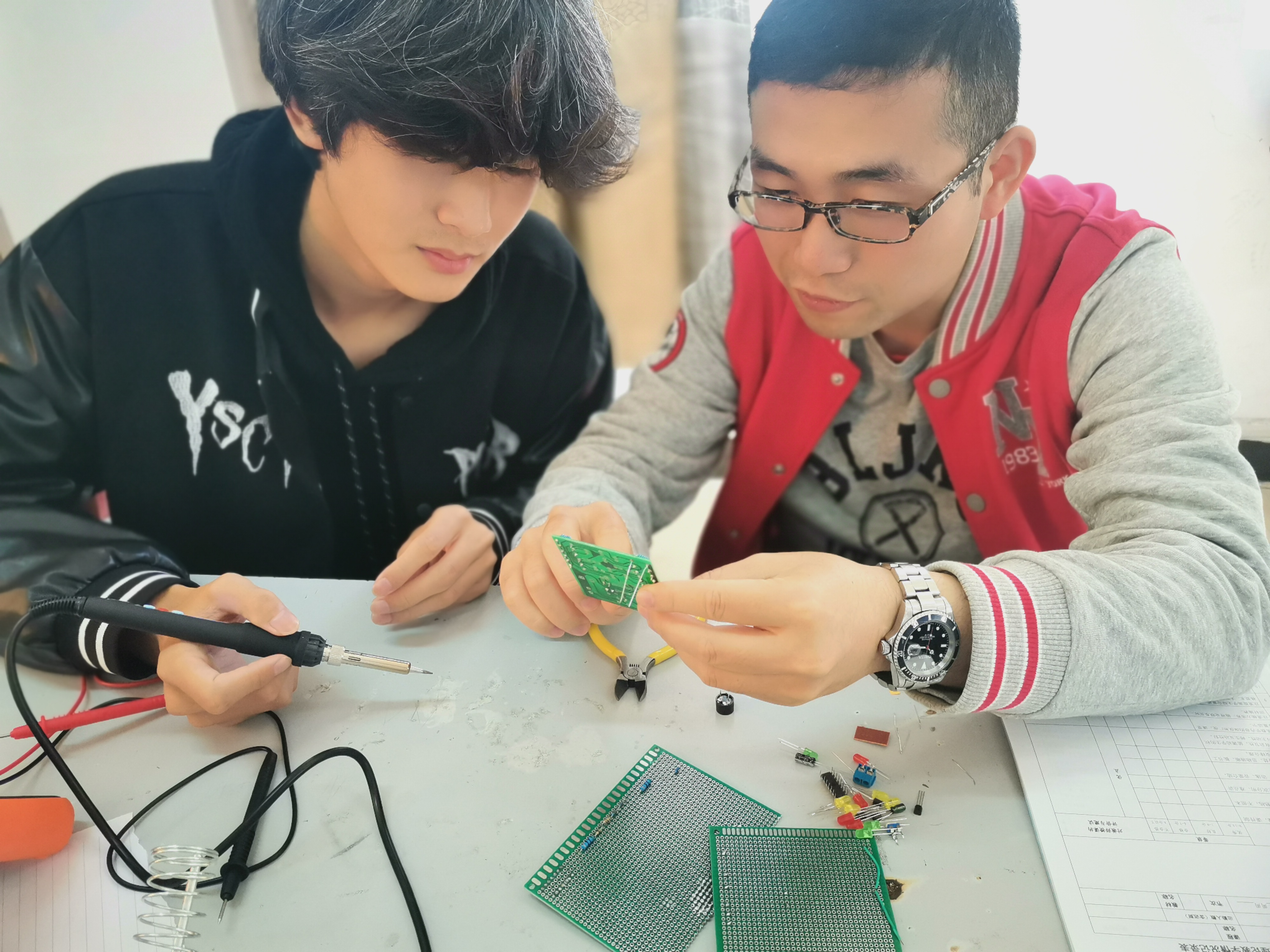 实践耗材发放后,在授课老师的邀请下,黄超老师也参与到本次实践课的指导中,给部分小组讲解元器件的名称、功能、作用,演示元器件焊接过程,分享焊接过程中的经验和技巧,提醒同学们用电安全,注意电烙铁不要烫伤自己或者同学。