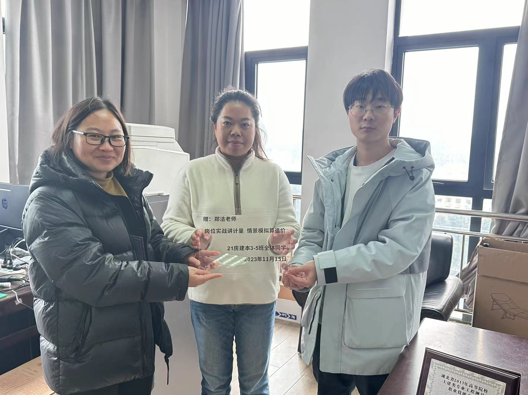 本网讯(通讯员徐卫国 龙海利)2023年11月15日中午,综合楼1005办公室里,土木工程系老师在系主任尚海静的组织下,准备开展日常教学研究活动,忽然进来一群学生,径直走到郑洁老师面前,大声说:“郑老师,谢谢你为我们21房建本3-5班(专升本)全体同学讲授了精彩的《工程概预算与招投标》,让我们真正学到了知识和技能。”原来是21房建本3-5班(专升本)的团支部书记、班长和学习委员,代表21房建本3-5班(专升本)全体同学来感谢郑洁老师的。尚海静主任听学生讲完后,高兴地从学生手中接过学生为郑洁老师定制的“岗位实战讲计量 情景模拟算造价”纪念牌,并把“岗位实战讲计量 情景模拟算造价”纪念牌亲自交到郑洁老师手中。