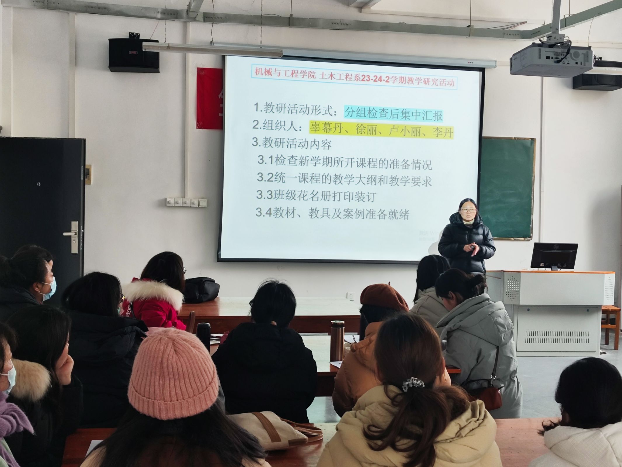 本网讯(通讯员龙振华 徐卫国 张白羚)2024年02月27日土木工程系全体教师在4教-201教室举行《集体备课》活动,活动由系主任尚海静主持,教研活动形式采取分组检查后集中汇报方式,分别由专业基础课程组辜幕丹、力学结构课程组徐丽、房建路桥课程组卢小丽、施工管理课程组李丹负责组织执行,此次活动的内容为检查新学期所开课程的准备情况、统一课程的教学大纲和教学要求、班级花名册打印装订、教材、教具及案例准备就绪。系主任尚海静要求各个课程组和全体老师认真对待此次活动,对照《人才培养方案》的要求进一步修改和完善教学大纲,按照新工科背景下职业岗位的具体标准编写教案,把开学前准备工作做好。