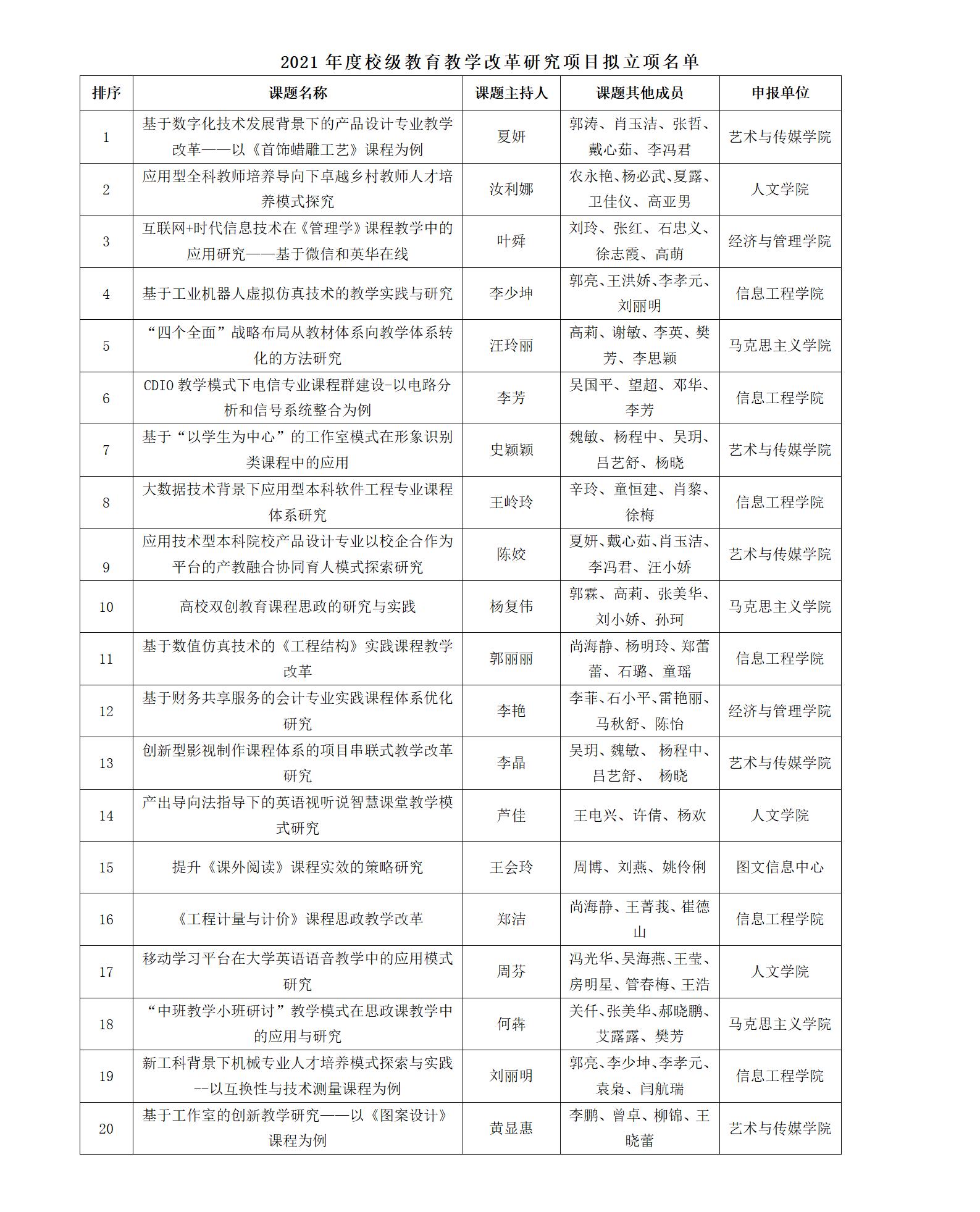 根据《关于开展2021年度教育教学改革研究项目立项申报工作的通知》(武工院教字〔 2021 〕68号)要求,学校开展了2021年度校级教育教学改革研究项目的立项申报工作。经个人申报、单位推荐、学校教学指导委员会专家会议评审,拟确定2021年度校级教育教学改革研究项目立项20项,现将拟立项名单予以公示。