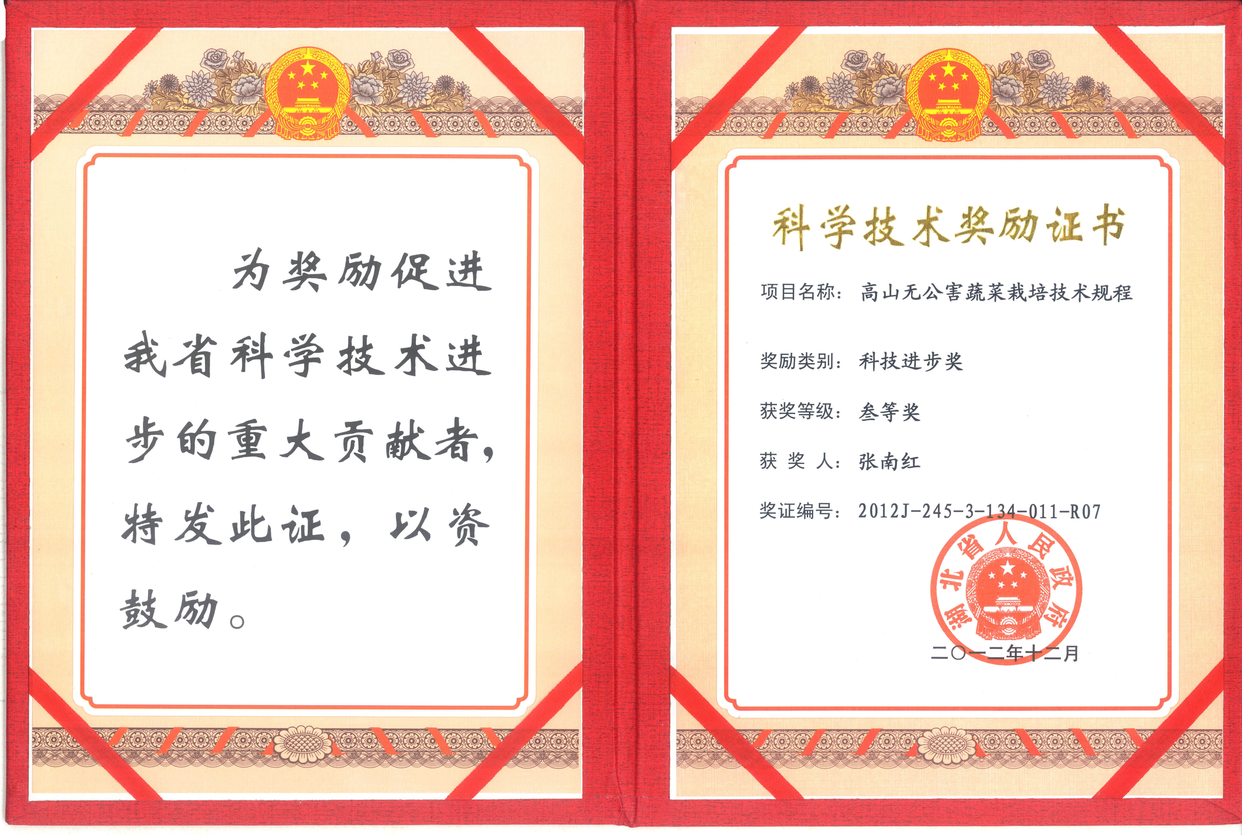 热烈祝贺张南红同志主持研发的《高山无公害蔬菜栽培技术规程》项目获湖北省科技进步三等奖