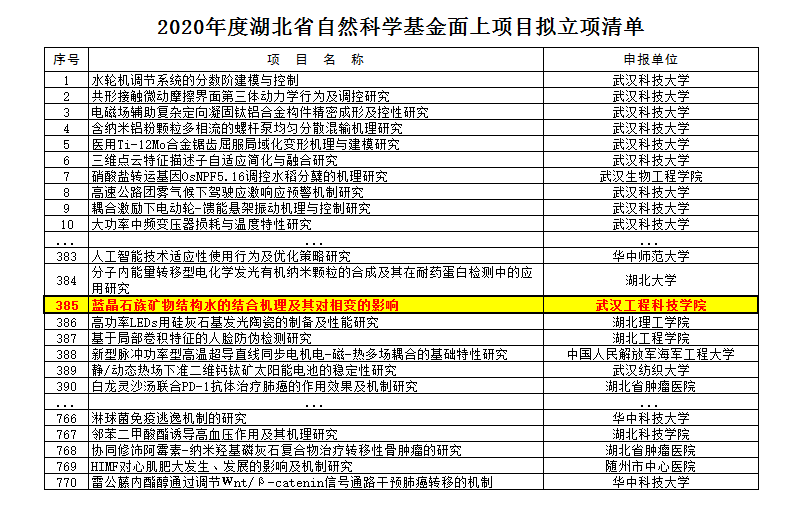 本网讯(通讯员姚伶俐报道)日前,湖北省科技厅公布了2020年度湖北省自然科学基金立项项目名单,武汉工程科技学院宝石及材料工艺学教研室张晓玲老师申报的项目《蓝晶石族矿物结构水的结合机理及其对相变的影响》获批立项。