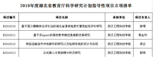近日,根据省教育厅下发的《湖北省教育厅关于下达2019年度科研计划项目的通知》,我校信息工程学院舒珺的《基于层次模糊综合评价法的湖北省滑坡地质灾害危险性评价研究》、吴云的《物品运输途中冲击破坏的研究以及检测系统的设计与实现》、郭亮的《立式离心水泵故障分析及研究》,经济与管理学院黎金玲的《基于多Agent的高校教学楼应急疏散仿真研究》4个项目被确定为2019年度湖北省教育厅科研计划指导性项目。