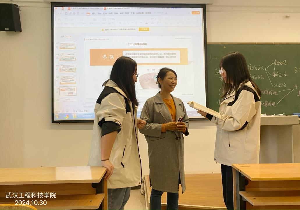 刘郦教授的教学方法灵活多样、内容丰富充实、语言生动形象,充分展现了其作为优秀学者的风采和魅力,不仅让同学们对马克思真理观有了更深入、更系统的理解,也为参加观摩学习的马克思主义基本原理教研室的青年教师们提供了一次宝贵的教学示范。课后,观摩教师们就教学中如何更好地以学生为主体、为学生解决真问题等困难向刘教授进行请教交流,刘教授从“了解学生需求”“构建合理的教学模式”和“运用有针对性的教学案例”等方面给予了启示与解惑,激发了观摩教师们对教学创新和课程优化的思考令各位教师受益匪浅,达到了良好的示范效果。