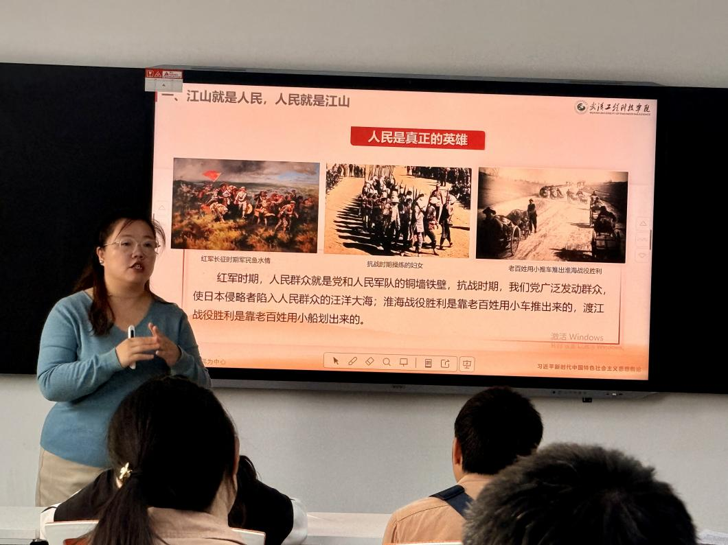 李英本次授课的内容是《习近平新时代中国特色社会主义思想概论》第四章坚持以人民为中心。围绕授课主题,她运用了历史唯物主义群众史观作为理论支撑,结合视频、案例引导学生体会“江山就是人民,人民就是江山”这个观点是中国共产党百年奋斗历程的真实写照与经验总结,从我国的政权性质和党的性质、宗旨引导学生领会“打江山、守江山,守的是人民的心”的深刻内涵,并从实践价值入手阐明深切领悟“江山就是人民,人民就是江山”这一论断的科学意蕴和实践价值就是要做到坚定人民立场、厚植人民情怀、汇聚人民力量。
