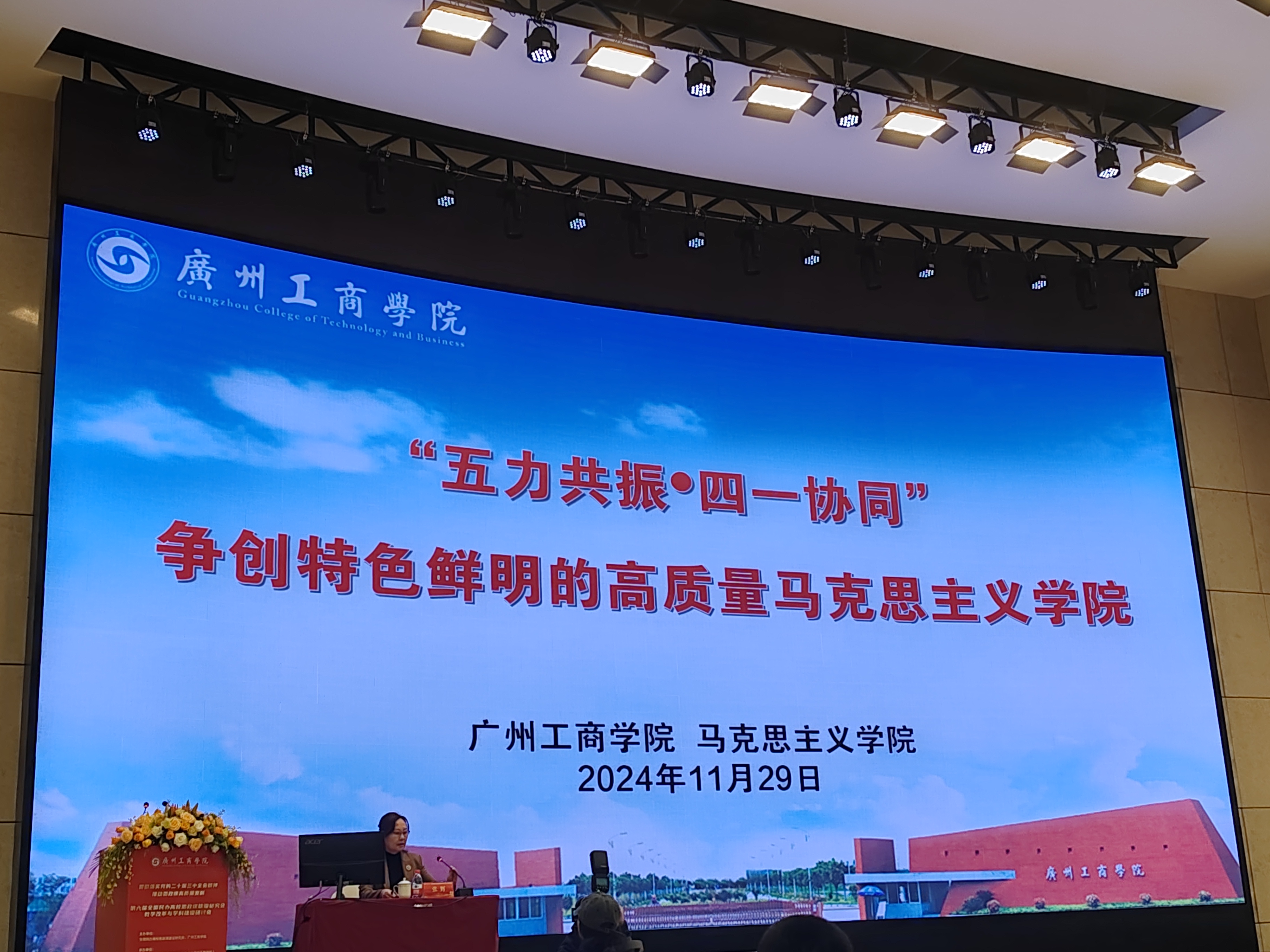 广州工商学院党委副书记、副校长兼马克思主义学院院长张辉作题为《“五力共振·四一协同”争创特色鲜明的高质量马克思主义学院》经验分享