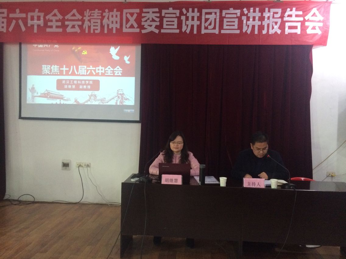 本网讯 12月14日至15日我校政治理论教研室主任胡继慧作为江夏区宣讲团成员,为江夏区委政法系统以及五里界街道办事处的全体党员共250余人宣讲十八届六中全会精神。