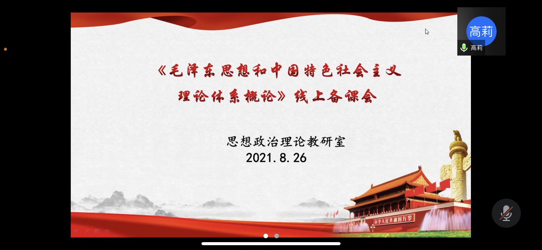 (通讯员 郝晓鹏)根据《武汉工程科技学院2021年秋季学期开学通知》和《关于做好 2021-2022学年第一学期线上教学预案的工作提示》(武工院教字﹝2021﹞40 号)精神与要求,为提高思政课教学的整体水平,切实保障线上教学质量,打造武工院线上线下混合式思政金课,8月26日晚八点,思政教研室主任高莉与《毛泽东思想和中国特色社会主义理论体系概论》(以下简称概论)全体教师以视频会议的形式开展了线上课堂演练和集体备课活动,会议由汪玲丽老师主持。